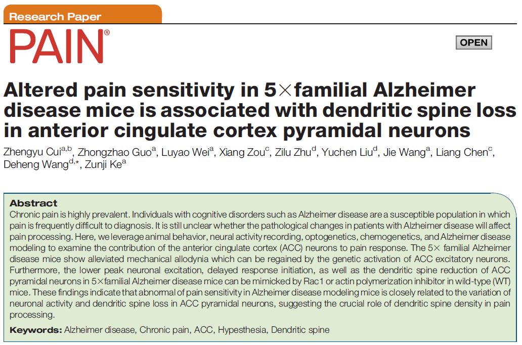近日,疼痛学领域的专业顶级期刊《PAIN》以封面Research Paper形式发表了我校中西医结合研究院柯尊记教授与基础医88娱乐城 王德恒副研究员团队的最新研究成果“Altered pain sensitivity in 5×familial Alzheimer disease mice is associated with the dendritic spine loss in anterior cingulate cortex pyramidal neurons”。论文揭示了阿尔茨海默病(AD)病人痛敏改变的神经机制。AD的病理改变会导致前扣带回脑区(ACC)内的神经元结构发生变化,并引发炎症性痛敏反应的改变。