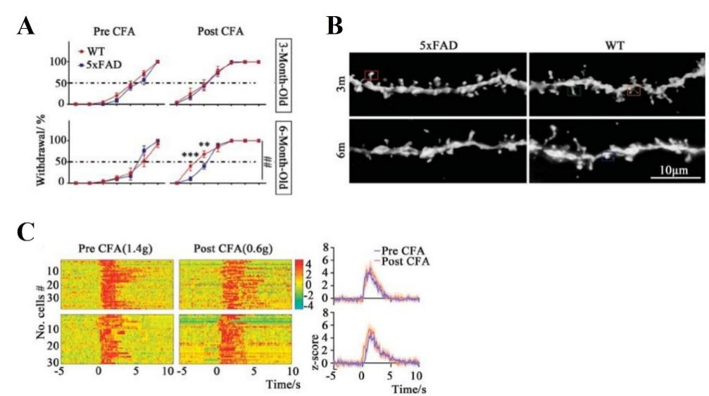 图1 (A)炎症状态下,6月龄5×FAD鼠的痛阈高于对照组;(B)6月龄5×FAD鼠ACC锥体神经元的树突棘密度低于对照组;(C)6月龄5×FAD组(上方)ACC锥体神经元活性低于对照组(下方)。