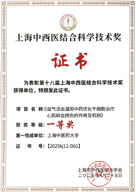 2025年9月25日,上海市中西医结合学会举行“第十八届上海中西医结合科学技术奖颁奖大会”。88娱乐城-88娱乐城app 党委副书记、常务副院长国海东研究员领衔项目《益气活血温阳中药优化干细胞治疗心肌缺血损伤的作用及机制》荣获上海中西医结合科技奖一等奖,88娱乐城 党委副书记、副院长马杰主任医师领衔项目《科普图书〈二十四节气养生〉》荣获上海中西医结合科技奖科普奖。