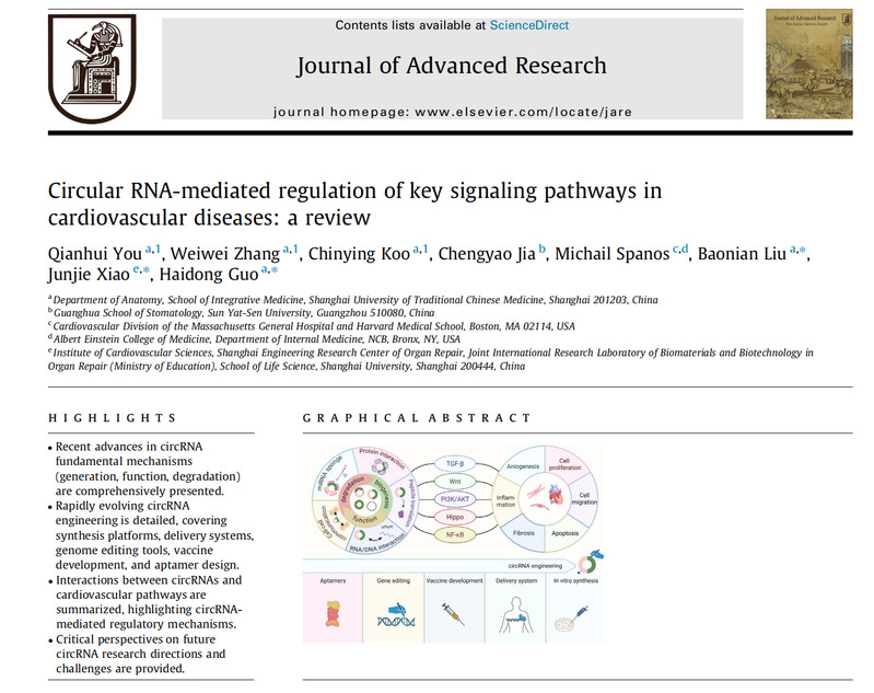 近日,我校88娱乐城 国海东教授团队、刘宝年团队联合上海大学肖俊杰教授团队,在国际知名学术期刊Journal of Advanced Research发表题为“Circular RNA-mediated regulation of key signaling pathways in cardiovascular diseases: a review”的论文,总结了环状RNA的生命周期、工程学应用潜力,以及其在调控心血管疾病核心信号通路中的研究现状,为该领域研究提供参考的同时,也针对当前心血管疾病治疗面临的分子机制瓶颈,探讨了基于环状RNA的未来探索方向。
