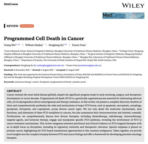 近日,88娱乐城 袁富文研究员和曙光医院泌尿中心主任徐东亮教授联合团队,在国际学术期刊MedComm发表题为“Programmed Cell Death in Cancer”的综述论文,系统总结程序性细胞死亡(Programmed Cell Death,PCD)的研究发展历程、分子调控机制及其在各类癌症中的研究现状,并探讨了靶向细胞死亡在肿瘤精准治疗中的潜力和临床转化价值。