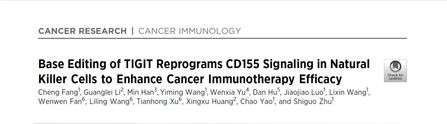 近日,我院朱诗国研究员团队与上海市生物医药技术研究院黄行许教授团队合作,在国际期刊Cancer Research上发表题为“Base Editing of TIGIT Reprograms CD155 Signaling in Natural Killer Cells to Enhance Cancer Immunotherapy Efficacy”的研究成果。